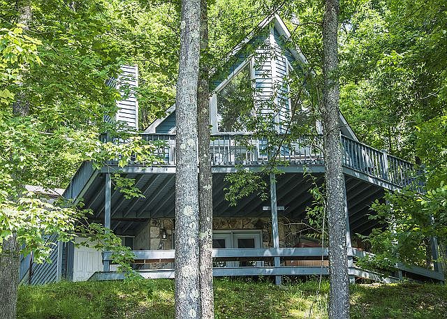 A Frame with 4 bedrooms, 3 baths, large great room and large game room with dock slip.