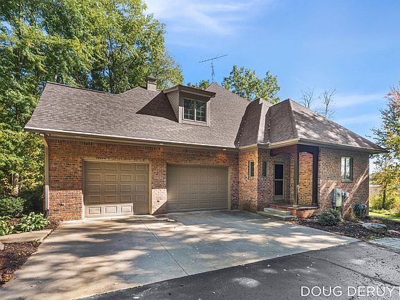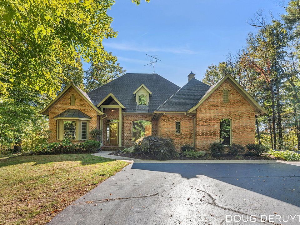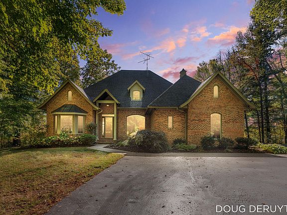 Discover luxury, privacy, and breathtaking natural beauty in this exceptional two-story executive brick home set on 27 wooded acres with 680 feet of prime frontage on stunning Leach Lake. Thoughtfully designed with high-end finishes and expansive living spaces, this residence features five bedrooms plus a sixth non-conforming bedroom that can serve as an office or game room, along with five and half bathrooms. Step inside to soaring 10-foot ceilings, and an open-concept living area anchored by a dramatic expanse of lake-facing windows, flooding the interior with natural light and framing panoramic water views. The gourmet kitchen is a showpiece, boasting quartz countertops, a tile backsplash, high-end stainless steel appliances, a double oven, and a gas cooktop-perfect for entertaining and everyday living. The main floor primary suite is a peaceful retreat, offering tranquil water views, private access to a screened in porch, dual walk-in closets, and a spa-inspired bath with a jetted tub and walk-in tiled shower. Upstairs, three spacious bedrooms each feature their own private baths, along with a versatile bonus room ideal for guests, hobbies, or a play space. The lower walkout level is built for entertaining, complete with a custom bar, wine cellar, explansive game room and family room and another bedroom and bathroom. Throughout the home, 8-foot doors and thoughtful architectural details add to the sense of luxury and craftsmanship. Outside the amenities are just as impressive. A three-stall attached garage, a 26x40 outbuilding, two animal barns, and an aviary provide ample space for storage, hobbies, or animals. Professionally landscaped grounds include composite decking and a composite boardwalk leading to the lake with an included dock, plus an above ground pool for summer fun. Modern conveniences include two furnaces with zoned heating and cooling, natural gas, wiring for a whole-house generator, WOW internet from the house to the street, and city sewer.