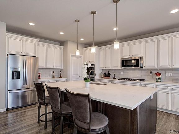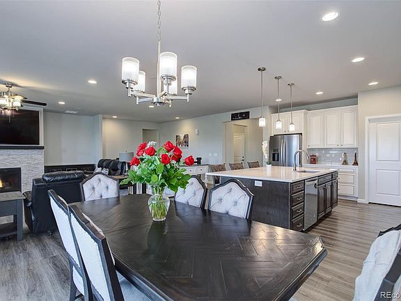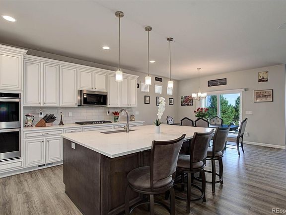 Gorgeous in every way, this beautifully appointed home has unparalleled upgrades and a beautiful location. Meticulously maintained, the main level offers high ceilings throughout, beautiful warm hardwood flooring, a bright study/flex/office space with French doors, a magnificent kitchen with spacious quartz counters, high-end cabinets, stainless steel appliances, a large pantry, a beautiful grand island, all of which is flooded with cool natural light. The big, bright, great room features a focal point fireplace and perfectly adjoins the kitchen and dining areas. The primary bedroom is an oasis at home with tasteful, elegant decor, a five-piece bath, new carpet, and enormous walk-in closets with custom built-ins, organizers, and dressers. The bathrooms are beautiful with granite counters and plank tile. The lower level is equally as impressive featuring a full kitchenette with granite counters, custom cabinets, stainless appliances including a beverage cooler, refrigerator, and dishwasher, an expansive entertainment area, and large bright bedrooms with enormous closets. Go to the movies at home! with the impressive in home theater, and a beautiful full bath. Storage abounds in the lower level! Outside is open space to behold, with countryside views and open spaces. Inspiring morning sunrises from the large covered rear patio, and peaceful sunsets from the covered front porch. The oversize 3 car garage is fully finished and offers plenty of storage. All of this in a home with with a community feel, miles of paved and natural trails, a pool and beautiful family and pet friendly parks and playgrounds, a community hops garden, tennis courts, acres of open space, this neighborhood has it all. This truly is a must-see, parade of homes style property that is larger in lot size and square footage than the competition.