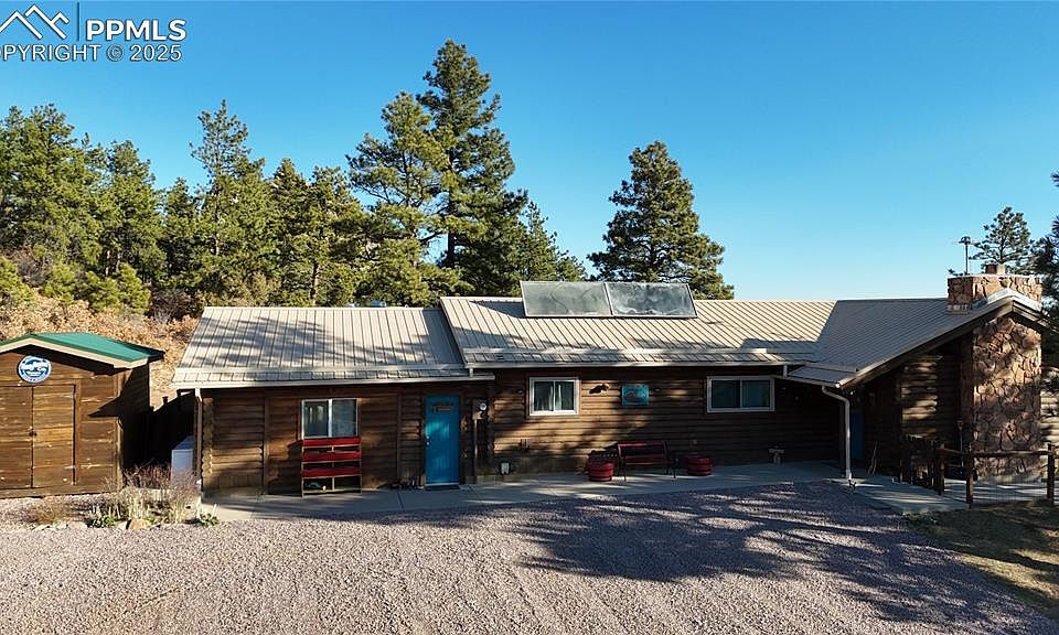 Conveniently located only 30 minutes from Pueblo and 45 minutes from Colorado Springs, this rare gem sits nestled on the mountain with a side deck overlook of Pike’s Peak and Pueblo. The log cabin-styled home is situated in the center of a 37-acre lot a half mile off the main road. There are approximately 20 acres of wooded pines with 4 carved out trails, one that leads down to the creek at the corner of the property. The portion of land covered with scrub oak can be cleared and used for livestock. There is a half-acre kennel for goats, dogs, or both. Connected to the kennel are two full-size chicken coops. Also on the property is a 10x50 ft. greenhouse with 6 raised beds inside and 3 outside. The back yard is fenced in with a 5 ft. privacy fence to keep dogs in and wildlife out. There is a 12x16 ft. gazebo in the back yard that is great for entertaining guests. Electric is run in the back deck to support a hot tub. The house has many updates, including concrete sidewalks poured around the entire house, granite countertops in kitchen and bathroom, hardwood teak floors, copper sinks and four new Champion windows. The utility room was recently converted into a second bathroom, with all new amenities. Well water is provided, with a new filtration system inside the house and an updated on-demand water heater. Pictures do not do it justice. Come and see!