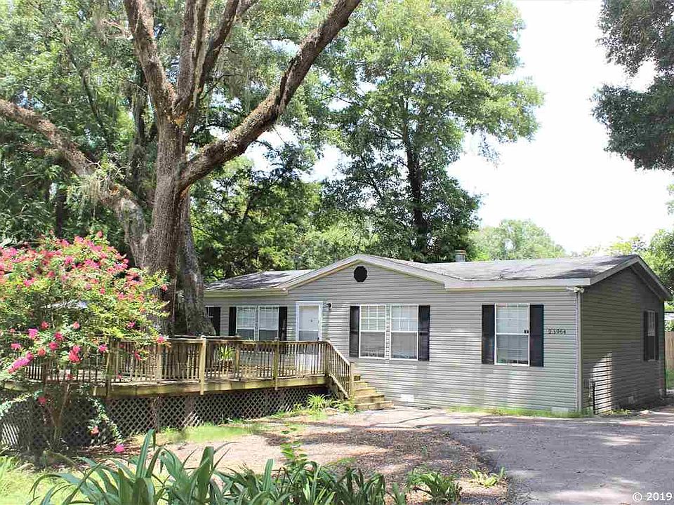 Come to High Springs to make your new home this nice, neat, very affordable 2007 mobile home which is quietly tucked away on a 1/3 of an acre right in the heart of town! This is a 3 bedroom home, that has been modified currently to 2 bedrooms, with large closets, but could easily be converted back. It also has 2 bathrooms. Home boasts crown molding, updated low maintenance vinyl flooring in a majority of the home, an open concept kitchen, a pantry with an indoor laundry space and a wood burning fire place. There is a massive wood deck on the front of the home to sit and enjoy the tree canopy that gives shade to this home and lot. A paved driveway with parking and a fully fenced yard. There is also a 12X20 storage shed, w flooring and electricity to store your outside toys. Call to set up a time to see this home today!