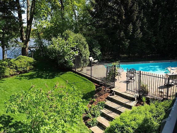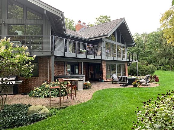 Resort living begins here. Welcome to Fox Riverfront living at it's best! This is one of those homes that you pass by on a quiet ride down the water and marvel at the beautiful landscaping and the private pool while admiring the gorgeous home. Imagine living on waterfront property with over 220' feet of Fox River frontage complete with a sandy beach, in-ground pool and nearly 7 magnificent acres for the ultimate in private estate living. The grounds of this home are, by all standards, extra-special and the interior of this home takes advantage of all of it with views from nearly every room. Begin from the long, private tree lined drive up to the front and into the dramatic entryway that boasts soaring wood planked ceilings complemented by gleaming hardwood flooring which is found throughout much of this floor. On the other side of the towering stone fireplace is the living room with probably the most dramatic views of the river from the floor to ceiling windows. The nearby kitchen and dining room include an Thermadore induction cooktop, built-in ice maker, trash compactor, beverage cooler, JennAir built-in ovens, huge center island with breakfast bar, gorgeous granite countertops and loads of cabinetry and storage space-a serious cook's dream kitchen! The light filled sunroom is just off the kitchen/dining room and is surrounded by sliding doors that lead to the deck. On the other side of the living room, you will find the all-important home office with built-in bookcases and river views and just down the hall is a second bedroom, newly updated hall bath, and laundry room. The master retreat also resides on this floor with a private door to the deck, a huge walk-in closet, and a super spacious master bath with private commode and bidet, whirlpool tub, separate shower and multi-light changing mirrors. The walk-out lower level wears many hats with 3 additional bedrooms, a hall bath, family room with fireplace, game room, a second office and a full kitchen. This is the ultimate area for an in-law space, boomerang family members or long-term guests. This space is also perfect for year-round entertaining where the sliding door opens to the paver patio with access to the built-in pool (newly updated), the yard and onto the incredible beach. Other amenities include a 4th "garage" bay that is accessed through the second office and holds all the toys for river and backyard activities, a 26' x 8' storage room, a private pier with electric boat lift, an outdoor sprinkler system that uses river water plus much more! Own a little slice of paradise! You deserve it!
