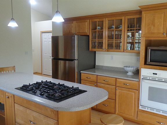 A RAISED-RANCH, with a stunning kitchen....great counter space, with an island in the center, a large pantry and beautiful Maple cabinets...a gourmand's delight.. The dining area has French doors to the huge deck.....from which you'll enjoy the beautiful yard....this is a very private setting........ The master suite on the main floor has a bathroom complete with a jetted tub and shower. The other three bedrooms are at the lower level, along with a full bath and large family recreation area. This is an ideal floor plan for a family and guests...everyone has space. A bonus room above the garage has room for a game table, and a sauna room.......(no stove)...with under-floor heating Recent upgrades include a furnace, new below-floor heating in the family room, new baseboard heating in lower level, extensive interior painting; new refrigerator, dishwasher, and microwave; carpeting in master and tile and carpeting at lower level, garage door opener, connection to the Village water system, new ceiling fan in master bedroom............the home will feel 'like new' to you. The fireplace is not in working condition.