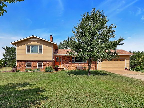 HARD TO FIND RURAL PROPERTY / 9 SERENE ACRES! Discover the charm of country living with this beautiful 4 BDRM/2 BA/2 CAR house, with additional outbuilding. It offers a warm and inviting full brick fireplace for the cooler days. AND, for those hot summer days you can relax in the refreshing above-ground pool with large wood deck. The 40 x 30 building offers versatile space for boat, RV, tractor storage or hobbies. Behind outbuilding is a fenced corral with lean to. Bring your horse, cows, chickens and animals to the fenced property. Also, enjoy seeing the deer, quail, turkey and pheasant frequently spotted. This property is situated on a peaceful dead-end road, this home offers tranquility and privacy. Only 2 miles from Cheney Lake! Don't mss this opportunity to embrace country living at its finest!