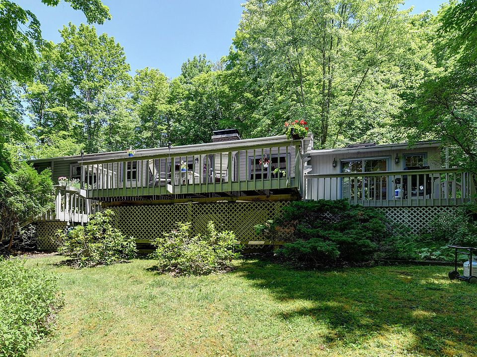 Nestled in private Richmond lot on 3.1 acres this attractive Log Home must be seen to be appreciated. The large, oversized brick Fireplace is in the center of its living space open to eating area & kitchen. To one end are 3 bedrooms, 1 is the master ensuite. The other end is an added dining area & family room. Enjoy multiple decks front & rear overlooking the spacious yard. Downstairs a finished basement with fire place, with cold storage area for wine cellar & music room. Then walk into the drive under garage which houses the 2-400 gallon stainless Oil tanks for the heating system which is new. New roof! New Septic design in place & awaiting installation. Move right in!