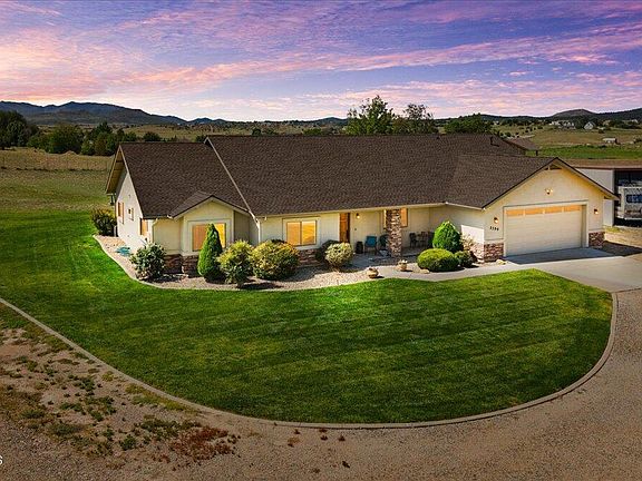 Country living at its finest! And only 3 Minutes to town, schools and shopping. This beautiful 4-bedroom, 2-bath home offers plenty of space and comfort with 2,688 sq. ft. of living area designed for everyday enjoyment. Nestled on 2 acres, it captures breathtaking panoramic views you'll love year-round.The heart of the home is the spacious kitchen with an open-concept layout, granite countertops, and room for more than one cook to create meals together. The inviting living area features soaring vaulted ceilings, a cozy fireplace, and 8-foot doors that add to the home's charm and character.For those needing extra storage or hobby space, this property comes with not 1 but 2 garages: an attached 2 car AND a detached 2 car garage/workshop. A private well with water rights provides peace of mind, while a newer roof (installed in 2023 on both the home and second garage) ensures years of worry-free living. Private road with no through traffic will be perfect for horses to go and ride in this beautiful landscape.This is the perfect blend of country serenity, modern comfort, and wide-open space ready for you to call home.