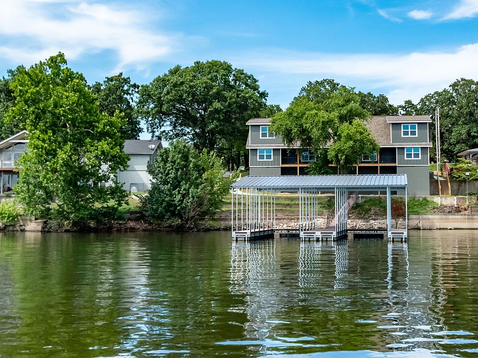 Great weekender and investment property. Honey Creek lakefront, new construction, new covered boat dock with 12'x30' boat slip, in town location with city utilities, close to Honey Creek Marina and downtown Grove. Lake front duplex features open living floor plan, spacious kitchen, island bar, stainless appliances, granite counter tops, sliding glass doors open to covered deck, black rod iron railing and overlooking Honey creek waterfront. The main level features open living, kitchen and dining room, 2 guest bedrooms with full bath between. Master suite is on the second level, fabulous lake views, walk-in closet, full bath, granite counter tops with tub shower combo. VRBO potential, Sellers are licensed Realtors in Oklahoma. Sale both units $550,000.