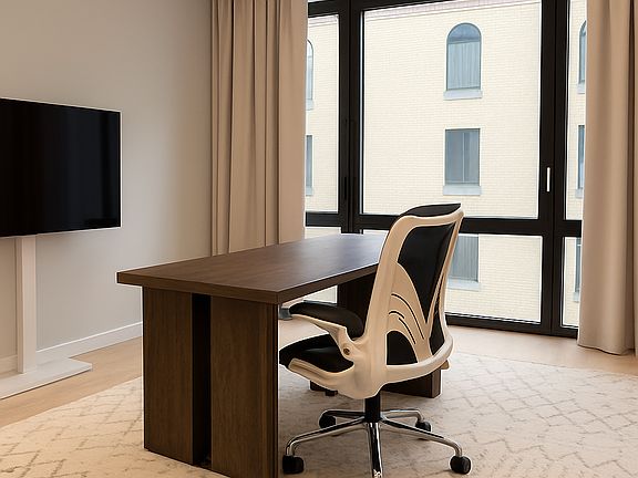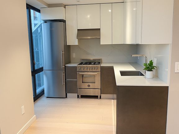 As you enter this stunning apartment, you're greeted by floor-to-ceiling windows that fill the open-concept living space with natural light. The chef's kitchen is outfitted with Miele appliances, sleek cabinetry, and a vented range hood perfect for cooking and entertaining. The spacious bedroom features a full wall of windows and comfortably fits a queen-sized bed. In the bathroom, enjoy heated floors that make every morning feel luxurious.