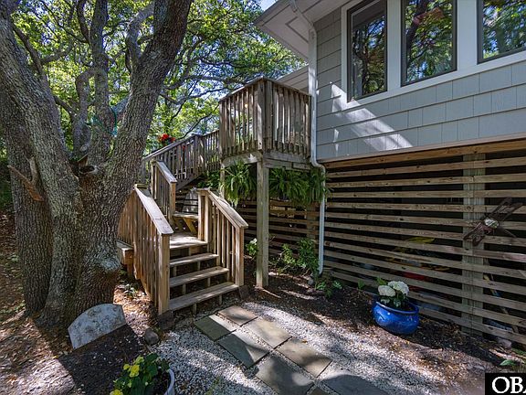 Nestled beneath a canopy of majestic live oaks, this home is a true sanctuary—where modern design harmonizes with nature to create a serene treehouse retreat. Boasting five bedrooms (septic permitted for four) and three baths, this thoughtfully designed residence offers an effortless blend of style and comfort. Wide-plank engineered oiled hardwood flooring extends throughout the upper level, infusing warmth and character into every space. Lofted ceilings with striking accent beams enhance the airy, sophisticated ambiance, while rich wood tones amplify the inviting aesthetic. A gas fireplace anchors the great room, casting a cozy glow over the open-concept layout. The chef’s kitchen is a culinary experience featuring quartz countertops, custom cabinetry, and a propane range—perfect for inspired cooking. The dining area flows seamlessly into the screened porch, offering a tranquil retreat to unwind and take in the surroundings. The four upstairs bedrooms are elegantly positioned behind a pocket slider, allowing for separation while maintaining the openness of the design. The primary suite is a private sanctuary, complete with two spacious closets featuring custom shelving and an ensuite bath adorned with marble accents and refined finishes. A skylight bathes the shared bathroom in natural light, accentuating the sleek rain shower wrapped in custom tile, delivering a spa-like experience. Downstairs, a newly added flex space with a private entrance and bath offers endless possibilities—a media room, craft space, or guest suite. Adjacent to the suite, another versatile flex area awaits—ideal for a Pilates studio, art room, or private office, also with its own separate entrance. Outside, the expansive yard invites children, grandchildren, and pets to roam freely, with ample space for a future swimming pool or addition. Just a short walk from the Southern Shores beaches, this home embraces the essence of coastal living while offering unmatched tranquility. Whether you're seeking a vacation rental, second home, or primary residence, this coastal retreat is a rare gem waiting to be discovered. The Southern Shores Civic Association (SSCA) enhances the lifestyle with access to a sound-side beach, boat launch, marina, tennis courts, scenic walking trails, beach access, park, and more—with separate memberships required for marina and tennis courts. **Installed in 2019 LP SmartSide siding with no paint guarantee for 30 years**