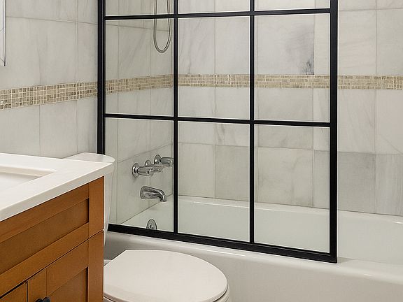 Full bathroom with tiled walls, bathtub, and updated vanity