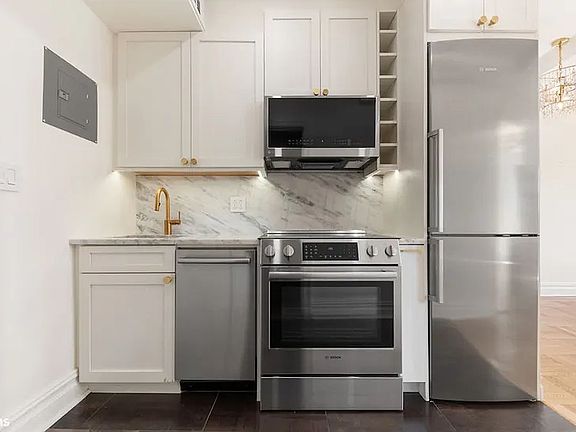 This move-in ready home impresses with tall beamed ceilings that reach over 9' in the living room, hardwood floors, and renovated details throughout. The large living room provides a generous footprint for seating and dining areas alongside classic south-facing windows. In the gorgeous, renovated kitchen, discover clean white cabinetry trimmed with gold hardware fixtures perched above elegant marble counters and backsplash, as well as Bosch stainless steel appliances including a range, microwave, refrigerator, and dishwasher. The expansive king-size bedroom boasts a tastefully upgraded bathroom featuring high end gold fixtures. A walk-in closet in the bedroom, a second walk-in near the entry and a pantry closet in the dining space ensure storage will never be a concern in this exquisite Greenwich Village gem.