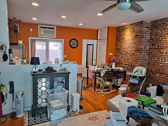 Perfect work from home, small hip apartment with exposed brick wall and accent lighting. Separate den adjacent to bedroom for home office. Lovely balcony out back with sliding doors to take a breather and relax. On site Laundry with coin washer. Only 4 units in building each on their own floor, so low noise and tenant traffic. Units are wired for cable or Fios. Located 1/2 block from Blvd East with buses only 20 minutes to NYC (NJ Transit and private buses - run every ten minutes almost 24/7). One block to shops and stores, no car needed to live in the area. Unit has cherry wood kitchen cabinets with dishwasher in open kitchen/living room with ceiling fan and wall unit AC setup. Hardwood floors throughout with granite floor in bathroom. Intercom system for entrance and very secure with camera systems throughout. Well maintained building (has been totally gutted and renovated, built 1860) with responsive owner. Parking is available separately. No Smoking building.