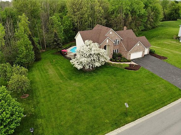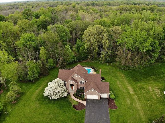4.29 acres in the HEART of Chili in Chili's PREMIERE neighborhood Autumn Wood! This stately colonial offers a dramatic 2 story foyer w/gorgeous staircase & windows! Enjoy 9ft ceilings, a HUGE kitchen w/island seating, BIG dinette & hardwood floors! The cathedraled fam rm is complete w/fireplace & the spacious liv & dining rms can accomodate any size gatherings! The mstr br features a deluxe mstr bath w/double vanity, shower, jetted tub AND water closet! 4 spacious br's PLUS a 1st floor den/home office & 3 car gar! The walkout lower offers an Inlaw/guest suite w/full bath & sliding doors to the back yard! Plenty of outdoor entertaining on the 2nd story deck overlooking the AWESOME ingound pool area w/wooded backdrop & own hiking paths to boot! Updated mechanics & brick facade too!