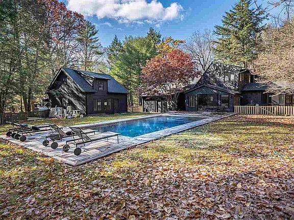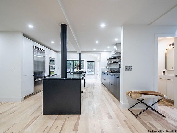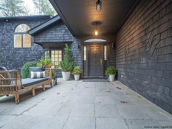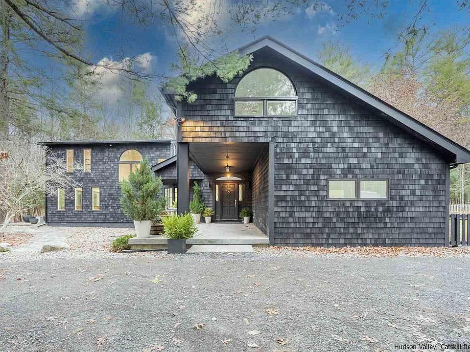 Here is an immaculate, completely renovated, excitingly modern contemporary with a natural country twist. Nestled within 8+ acres of nature's beauty on a private road, yet only 7 minutes to Woodstock, this home was designed for a life of luxury. Upon entering the home you're enveloped in a bright and open living space with clean sleek lines, solid Birchwood floors running throughout and an abundance of windows and skylights bathing the space in the warmth of natural light. The foyer leads you into a Dwell style sitting area where a wood burning fireplace sets the mood infusing the space with a homey and inviting vibe. A bay window nook with bench provides the perfect place for your guests to sit to remove their boots or the coziest space to curl up with a blanket and read book. The kitchen is pristine with all new Viking appliances, two islands w/breakfast bars, soapstone countertops throughout, plenty of cabinet space, a walk-in pantry, a wet bar (complete with cabinets and shelves) and a plethora of windows and skylights leading you to a sliding glass door that opens out to the pool area. The dining room is classy and intimate with large windows framing an ever-changing view of nature while you dine. The expansive living room is lit by lavish windows and a sliding glass door that draws you out to a bluestone patio. This home was designed to entertain with one space flowing into the next. Completing the main level is a half bath, a laundry room and a newly screened-in porch surrounding by mature trees. Up a small stairway is a loft, with built-in shelves, and a flexible space that could easily become your library, meditation space or your work-from-home space. Past that stairway, down a small flight of steps, is the 1st guest bedroom with en suite bath with shower, porcelain concrete tiled floors and private entrance. This would work perfectly for overnight guests or Airbnb. The second floor is home to the Master Bedroom with en suite bath, two guest bedrooms and an additional full bath. The main guest room boasts a Juliet balcony, a large closet and its own entrance into the full bath with deep soaking tub, stand up shower and skylights. The Master Bedroom is flawless with a custom-made headboard w/built-in USB outlets, skylights with motorized covers and a light and airy bathroom with a unique u-shaped floor plan. This bathroom is state-of-the-art with a custom soapstone double vanity positioned to bask in the natural light. There is a deep soaking tub, a large standup shower with dual shower heads, a sitting/dressing area, and walk-in closet as well. Walking outside this home leads you the perfect spot to spend your time enjoying resort-level relaxation. The fenced-in Gunite, saltwater, inground pool contains a sun shelf and hot tub all embraced in an Ipe deck. It's completely private and the discrete electric auto cover is energy efficient and extends the pool season by months in either direction. After spending the afternoon poolside, you and your guests can rinse off in the outdoor shower before returning to the house. The two car garage w/carport provide protection for all your vehicles but also give you the option to just use the carport and transform the garage into a home gym. The garage windows have just been replaced and give the space a bright and open feeling, there is also a 2nd unfinished level that has vaulted ceilings inviting a transformation into an art studio, yoga space, home office, workshop, etc. Also on the property is the cutest little replica of a log home, housing one rustic room with electricity. It could be used as a play area, or hobby area.