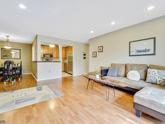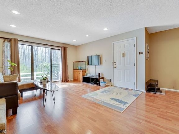 This spacious, bright and cheerful ground floor end unit is move-in ready! 2 bedrooms and 2 baths. Beautiful laminate floors. Kitchen with SS appliances, granite countertop, backsplash, updated cabinets and breakfast bar. Formal dining room opens to a living room with sliders to a patio with private views of lawns and woods. Master suite with large walk-in closet and updated full bathroom. Great second bedroom and another full bath. Utility room, washer and dryer in the unit. Assigned parking space with plenty of additional visitor parking. Convenient location to shopping, restaurants and I-78. Close to NYC transportation. 43 acre of manicured community near Pleasant Valley Park. On-site property manager, clubhouse, in-ground pool, tennis courts and bicycle paths. Top notch Basking Ridge Schools.