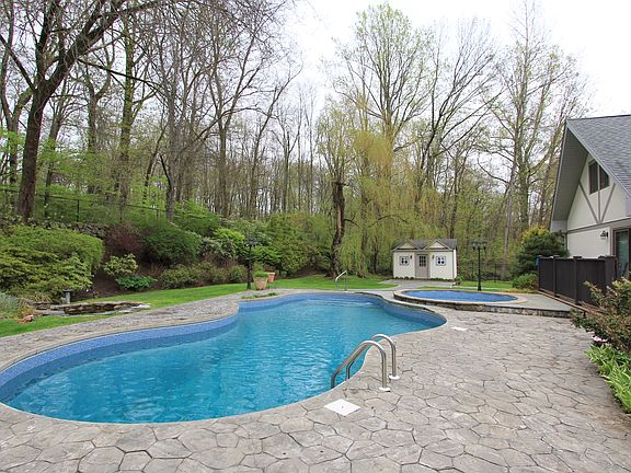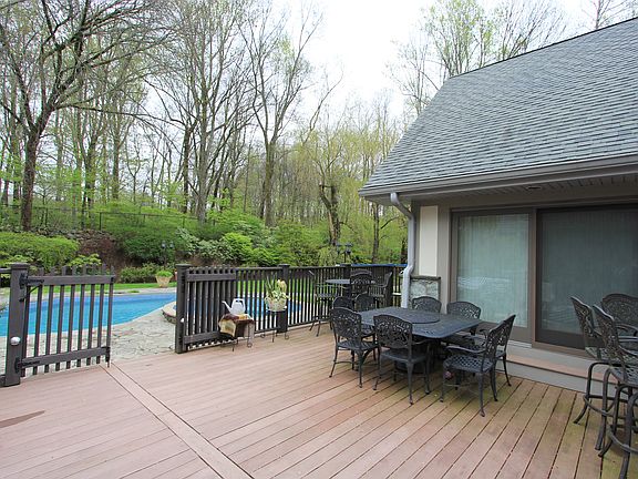 Picturesque setting at the end of a long gated drive. This beautiful property provides ultimate privacy and amenities. 5 bedroom 6 and 1/2 bath home featuring spacious Eat-in-Kitchen with granite & stainless, Living Room with vaulted ceilings and stone fireplace. Sliding glass doors from dining and living rooms to deck and fantastic pool with hot tub and cabana. Lower level provides more entertainment spaces including family room with full bar and fireplace, game room, gym and full bath with sauna. Convenient location with easy access to 684.