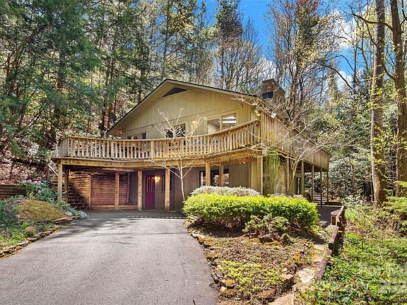 Calling all nature lovers to your retro chic mountain home, where convenience meets unquestionable beauty. Nestled on a 5-acre double lot with a stone-walled stream, a nearby creek, and winding walking trails, enjoy the seclusion and privacy of the forest. This 3-bed, 2-bath property features a unique layout highlighted by skylights that bathe the space in natural light. The vaulted living room with a gas fireplace flows into the charming eat-in kitchen which is perfect for casual dining and gatherings. Step outside to the expansive wrap-around deck surrounded by towering trees and lush foliage; this space is ideal for indoor/outdoor living. Descend the stairs to a separate retreat, complete with a bedroom, full bathroom, laundry room, plenty of storage, and a cozy living area with a second gas fireplace. Its peaceful surroundings, thoughtful design, and sought-after location make this home the perfect blend of comfort and tranquility for those seeking a retreat from the ordinary.