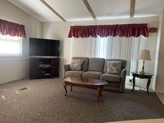 Welcome to the area's most sought after premier over 55 community with pool and clubhouse activities to make life more fun. Well maintained and spacious home with wide open floor plan vaulted ceiling and spindled wall open to kitchen. Vinyl replacement windows on the front with awning. Bright and airy kitchen, applianced with refrigerator, stove, dishwasher and over the counter microwave. Washer and dryer as bonus. Large main bedroom with attached bath featuring walk in shower and additional bedroom with spare bath. Nice 12' x 12' enclosed porch for out door sitting. Lot rent is $647 and that is mandatory but NO PROPERTY TAXES. There is a HOA that one may or may not join. Common pool for summer splash. Detached storage shed for lawn equipment or work bench.