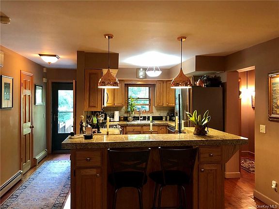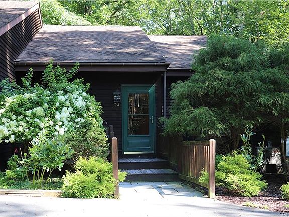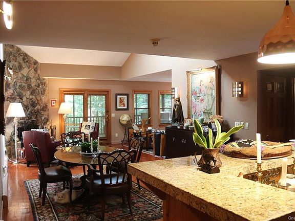 Walk in to vaulted ceilings, a grand stone fireplace, and sliding glass doors that show off deck and perfect backyard. Open floor plan from kitchen, to dining room/lounge space, and into the living room. Master bedroom features master bath, tremendous walk-in closet, and glass doors onto deck. Guest bedroom is on opposite side of the home for privacy, next to the second full bath. A mudroom guides you in through the spacious one car garage. Sunny office or play room. Plenty of closet space throughout. Brook runs through property, with a little island on it that attracts charming wildlife. Immaculate, turn-key condition. 5 minutes to Callicoon Main Street, hiking, and river access.