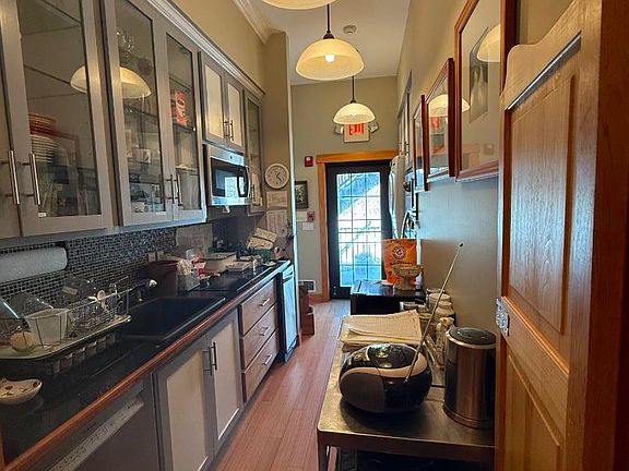 - AC, Ins, Floor 1: Three office spaces (one could be considered a first floor bedroom if wanted). There is a open space room with high ceilings and an abundance of natural light which is currently used as a therapy/treatment space with radiant heat (as well as FHA/AC). There are two full baths and a complete galley kitchen. A lovely covered porch serves as the entry to the main door; however, multiple doors provide access allowing for privacy., Floor 2: This is a separate apartment with two means of access, one from the exterior (with a little deck ) and one from the interior first floor. Two bedrooms share a full bath. The kitchen is fully equipped, and the living room is centered by a fireplace. An additional laundry room exists for the apartment. There is a generous unfinished space that could be easily converted to an additional bedroom, bath and living space. It is already framed and insulated and has access off of the living space in the apartment.