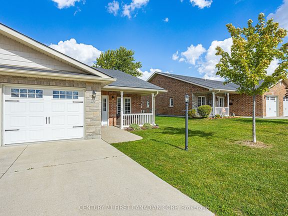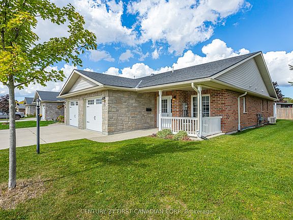 Welcome home to Riverview Meadows, Exeters premier adult lifestyle community. Discover easy, elegant living in this better-than-new 2-bedroom, 2-bath bungalow located in the quaint town of Exeter, just 30 minutes to London and 20 minutes to the shores of Grand Bend. This impeccably maintained home offers true one-level living with thoughtful design and modern comfort throughout. From the moment you arrive, youll appreciate the covered front porch, deep concrete driveway, and attached garage with inside entry. Inside, vaulted ceilings and abundant natural light highlight the open and inviting layout. Premium laminate and vinyl tile flooring provide style and easy maintenance, while the open-concept design allows seamless flow between the kitchen, dining, and living areas. The kitchen features light matte grey cabinetry, stainless steel appliances, and a spacious island with seating. The dining area and cozy living room with a custom mantle and gas fireplace create an ideal space for entertaining or relaxing. From the living area, step out to the large concrete back patio with composite privacy fencing and gas BBQ hookup. Enjoy the walking trail to the serene community pond with koi fish and a lovely gazebo-perfect for quiet moments outdoors. The large primary suite features a 3-piece ensuite and two walk-in closets, while the second bedroom, 4-piece bath, and convenient laundry room provide everything needed for comfortable everyday living. Riverview Meadows offers amenities including a large multipurpose room with kitchen facilities, (a great opportunity to host your family get-togethers) manicured green spaces, landscaped common areas, seasonal walking paths, professional management, and snow removal of roads. Experience low-maintenance living in a welcoming community designed for comfort, connection, and peace of mind, all just a short walk or drive to medical offices, grocery store & all Exeter has to offer! Where lifestyle meets ease.