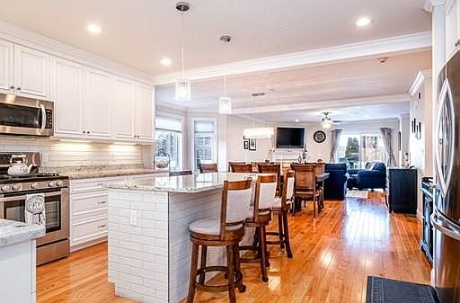 The WOW factor is here at 24 DEXTER. Stunning end unit HUGE Townhome w/ Open floor plan. Built in 2015 this Gorgeous unit is perfect for entertaining large family gatherings. ONE MASTER SUITE ON FIRST FLOOR. SECOND MASTER SUITE IS UP W/ WALK IN CUSTOM CLOSET and laundry. Hardwoods in every bedroom. Beautiful Kitchen with SS appliances, high end cabinetry and Granite countertops. Large Island with seating for three. Recessed lighting and soaring ceilings with crown molding. Luxury MANTOWN/Family Room with full wet bar in lower level w/ gas fireplace and Wainscoting. Original owners added a 1/2 bath in basement. Sliders to walk out composite deck overlooking town recreation field.Minutes to Patriot Place with shopping and dining options. Close to Major highways Routes 95,495 and train. This one will go FAST. Gas Heating/ Central AIR and on Demand HOT WATER.Appointment Required!