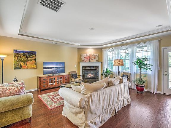 Equestra ''Waterfront Location''! This Hawthorne model professionally landscaped, backs up to a tree lined pond, approximately 400'+ covered paver patio, that extends out with an 18'x10' motorized awning. The front covered porch entrance with paver stone walkway, adorned with stack stone slate and matching columns. Enter through the arched walls leading into the flex room with double french paned window doors, textured HW floors throughout the main living area. The dining area has a tray ceiling with wainscoat trim. The kitchen with upgraded maple wood 42'' cabinets and granite counter tops, tiled backsplash, trimmed with SS appliances and 4 stool breakfast bar. M/bedroom with 2 closets one professionally finished walk in, that leads to a seated seamless glass shower. Make it yours!