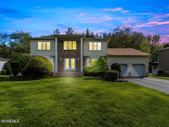 Welcome to 24 Eastwood Blvd, a stunning C/H Colonial nestled in the desirable neighborhood of North Manalapan. This meticulously maintained 5-beds, 3.5-bath home boasts over 3100 sq ft of living space on a generous half-acre property. The first floor features a grand double door entry foyer w/ 2 coat closets, formal dining room & living room w/ bay windows and custom moldings, a large family room featuring a cozy wood-burning fireplace, an expansive eat-in kitchen equipped with custom European cabinetry, granite countertops, stainless steel appliances, a pantry, and sliding doors leading to a beautiful sunroom overlooking the private yard. Conveniently located on the first floor is an additional bedroom along with a powder room and laundry room and access to the 2-car garage. Upstairs, retreat to the spacious master bedroom complete with a walk-in closet and a fully renovated ensuite bathroom featuring a shower and garden bathtub. Three additional bedrooms and another full bathroom complete the second floor. Step outside to enjoy the tranquility of the outdoors on the Trex deck, overlooking the spacious yard backing to serene woods. This home has been thoughtfully updated with all new windows, a new Lennox furnace, water heater, AC, and roof. The fully finished basement offers an additional 1300 sq ft of living space, perfect for entertaining, a home gym, kids playroom or an office space. Waterproofed with two sump pumps and a French drain, the basement is both functional and versatile. Conveniently located on the border of Marlboro, with excellent blue-ribbon schools, nearby shopping, and easy commuting with a NYC bus stop within walking distance of the home. Don't miss the opportunity to make this exceptional property your new home!
