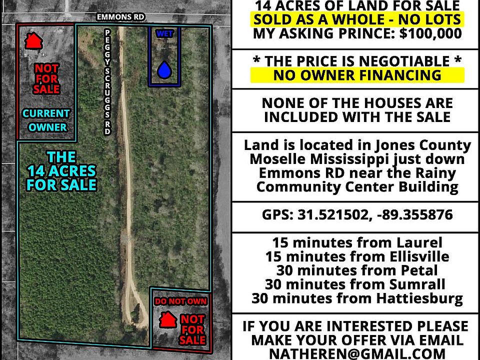 I am selling 14 acres of vacant unkempt land in order to purchase a mobile home to replace my damaged house. My asking price is $100,000 but I am open to negotiate. The land has a lot of thin trees, bushes, and shrubs that have grown up over the years so it will take a little work to clear it out. Water does build up in one spot near the road that drains out but it can be fixed by applying gravel or you can make it into a pond if you wish. None of the local houses are included with the purchase of the land. Payment will need to be upfront and there is no owner financing. You may contact me by email at natheren@gmail.com