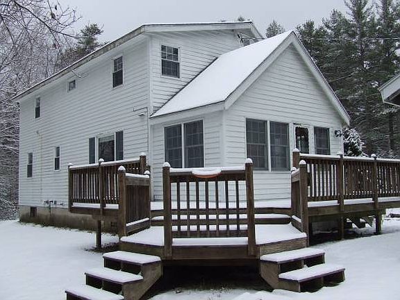 CLOSE TO SCHOOLS, SHOPPING AND ALL RECREATIONAL ACTIVITIES, this three bedroom, full-dormered cape offers a gorgeous three plus acre lot with perennial gardens and mature tree growth as well as lots of privacy. House features terra cotta tile entrance and kitchen, gorgeous fieldstone fireplace in living room, formal dining room, eat-in kitchen with maple cabinets and a first floor bedroom. Off the kitchen is a lovely three season sunroom which opens to multi-level deck with stairs to lawn and private granite fire pit. The second floor features two more bedrooms and a half bath. Partially finished lower level with laundry and wood stove. Convenience and comfort... that's what this fine home offers.