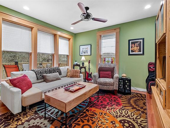 This magical Victorian cottage in the heart of downtown will steal your heart with it's unique design, custom wood work, stained glass, outdoor living spaces and a wet-weather creek. The main floor has a spacious living room with beautiful wood flooring. The gourmet kitchen has a slate floor, custom wood cabinets, granite counters and stainless steel appliances. The adjoining dining area has a bank of windows providing a view of the creek and built-in shelving. You can also enjoy dining on the deck off the dining room. The main floor bath has a slate/tile shower. Downstairs is a common area perfect for a tv room or home office. The main bedroom with built-ins also has glass doors opening onto a screened sleeping porch that overlooks the creek. A guest bedroom and a bath with a garden tub and laundry area complete the lower level. The walkout basement offers storage and a 12 x 16 room that could be used as a workshop, studio or gym. New HVAC. Two off-street parking spaces. Walk to downtown shopping and dining.