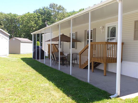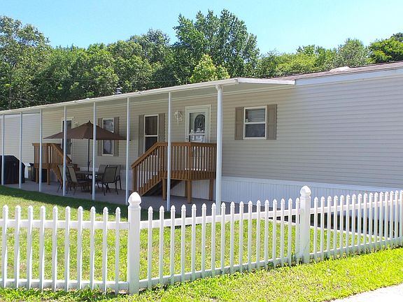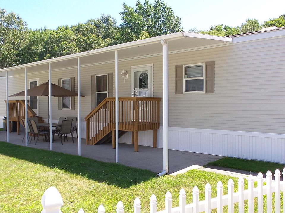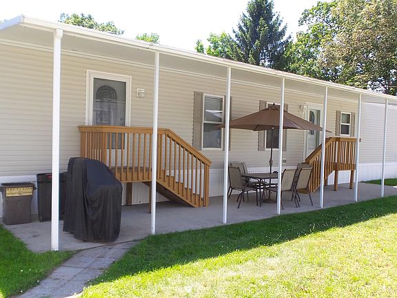 You will love this immaculately kept home. Why rent when you can own. New floors throughout!! Master suite is tucked away on its own with a walk in closet and big bathroom with double sinks and shower stall. Two additional bedrooms and another full bath with a tub are down the hall. Living room is nice sized and leads to a beautiful eat in kitchen with tons of cabinets and a full appliance package which includes a stove, refrigerator, dishwasher and microwave. Steps down the hall is a laundry area and an additional entrance. Outside you have a spacious, covered patio and grassy area and a nice sized shed for storage. Monthly fee includes well, septic, property taxes, garbage and recycling pick up twice a week, bulk pick up once a month, snow plowing and salting. Nothing to do but move in!