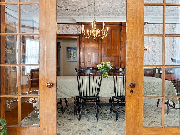 Step inside to discover soaring high ceilings & wood floors that exude character at every turn. The formal dining room is a showstopper, featuring a custom-built cabinet adorned with intricate woodwork that invites dinner parties. Stunning original wood sliding doors add to the home's distinctive appeal, leading to the sun-filled spacious living room with a fireplace. Down the front hallway, stroll to a seasonal glass-enclosed front porch—the spot for morning coffee or evening relaxation. The first floor features an updated and tasteful eat-in kitchen that opens to a stone patio for ideal outdoor lounging. Nestled on over 2 acres, the property showcases beautiful landscaping and mature trees creating an idyllic backdrop for outdoor enjoyment and tranquil retreats.