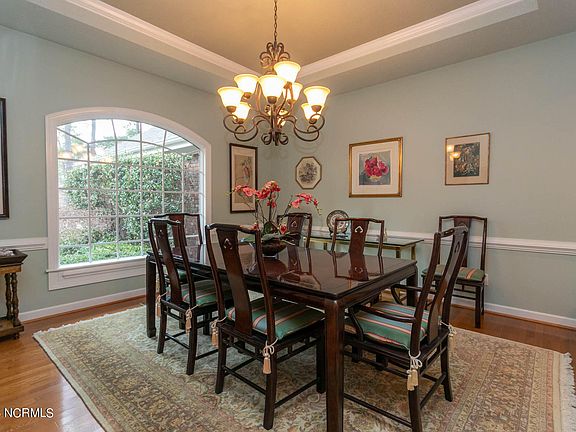 Gorgeous brick home nestled on a beautifully landscaped corner cul-de-sac lot in the desirable, gated Pinewild community. This split-plan home offers lots of great features and exquisite finishes. Feel the elegance as you step through the front door to a spacious tiled foyer with a columned entry to the living room with vaulted ceiling, columned opening to the formal dining room with half wall and tray ceiling and office with double door entry and transom above. The living room opens to a bright breakfast nook by windows and sliding glass doors to an enclosed porch. A gourmet kitchen has custom cabinetry, wood stain island with five burner Thermador gas cooktop, stainless steel appliances and raised breakfast bar. A spectacular family room has window walls with high arched transoms overlooking a tranquil backyard, gorgeous gas log fireplace and a wet bar with refrigerator and built-in wine rack. For added privacy, the windows in the family room have drop down sheer blinds. A spacious owners' suite has large windows overlooking the back and glass door to the enclosed porch, large walk-in closet and en-suite bath with separate vanities, lovely corner tub under, step-in shower and large double-door closet. The main level also includes a full guest bathroom with step-in shower, an access door from the enclosed porch, two bedrooms connected by a full bathroom and laundry room. There is an upper-level bonus room that could be a fourth bedroom suite with a full bath, lots of closets and walk-in attic space. The home is surrounded by mature landscaping and has a wide gravel driveway with concrete edging to the side-facing three-car garage. The back features a raised brick patio with low brick wall, brick paver walk to a lower patio, slate stone paths and several stacked stone landscaping beds. There is also a transferable Pinewild Country Club membership. This beautiful home is in immaculate condition!