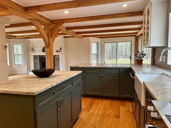 Whole house renovations are almost complete on this beautiful gambrel in Pelham. Situated on 1.38 peaceful, wooded acres, this home has the benefit of being less than a 10 minute drive from the center of Amherst and UMass! Comprising just over 2000 SF, the 4 bedrooms, 2.5 bathrooms, spacious open kitchen/dining/living room, and large, dry basement mean there is plenty of space to spread out. The first floor bedroom with separate entrance could be a wonderful home office or converted to a separate suite. A number of trees were recently removed to create more parking, a turnaround, landscaping, a sunny yard and room for a future garage. Improvements include a new septic system, all new duct work and whole house AC, updated plumbing, new lighting and electrical wiring, and more. A new kitchen, all new bathrooms with high end finishes, hardwood throughout, exposed timber beams and a gas fireplace all add to the cozy feel of this home. Schedule a viewing today!