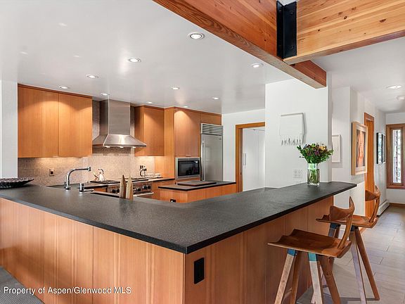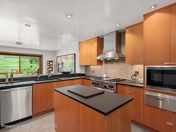 A light filled, contemporary 2 bedroom plus den, which serves as a third bedroom or office, with 3 full baths. Located on the 2nd hole of the Snowmass Club Golf Course with mountain/ski slope views beyond, in one of the most desirable neighborhoods in Snowmass Village. Just a 5 minute walk to the Snowmass Club, and nearby network of hiking and biking trails, gorgeous in all seasons. Enter into the great room with vaulted ceiling and fireplace plus a chef's kitchen with Wolf and Sub-Zero appliances and flamed and brushed granite countertops. Through glass doors, the dining room opens to the deck which looks out onto an adjacent pond. The main floor den/bedroom has 2 queen Murphy beds, and an adjacent full bathroom. Upstairs there are 2 bedrooms plus a loft. The master has built-in dressers with marble countertops in the bathroom, and glass doors onto another deck. Custom features include marble countertops, Runtel baseboard heaters, porcelain tile and EV charging port in garage. In the winter tracks are set for cross country skiers on the golf course. The free skier shuttle to slopes and Base Village stops a few yards from your front door. Beautiful landscaping, flowers, a pond, and stream in a quiet and private setting, yet close to Aspen. Great for a full or part-time residence.