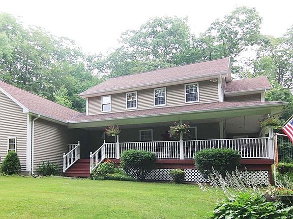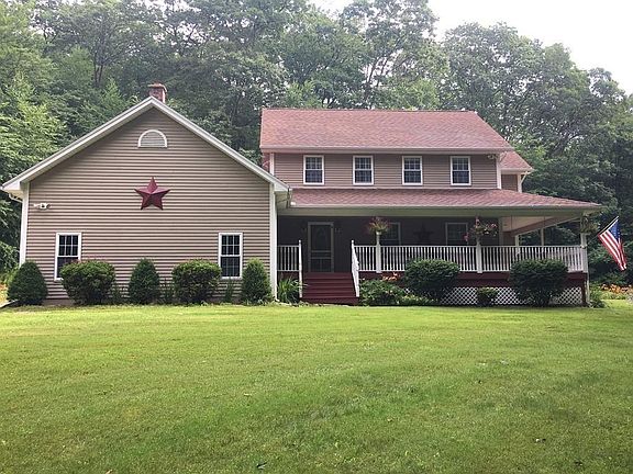 This wonderful one owner Colonial with a wrap around front porch is just waiting for you with just under 6 acres of privacy yet only a short commute to Westfield and Northampton. Over size two-car garage leads into a Mud Room. Family room with fireplace, ash hardwood floors and built-ins below a window seat. Eat-in Kitchen with lots of cabinets and a propane gas stove. Separate dining room and spacious living room with ash hardwood floors. Laundry Room and a full bath with tile floor complete the first floor. Second floor has three bedrooms, an office, a full bath with tile floor, and a large walk up attic. Large Master Bedroom with three closets and access to the full bath. Freshly painted and new carpet throughout the second floor. Whole house fan. Refrigerator in basement and wood stove in basement and garage to remain. Title 5 all set. All you have to do is unpack!!! You don't want to miss this one!!!