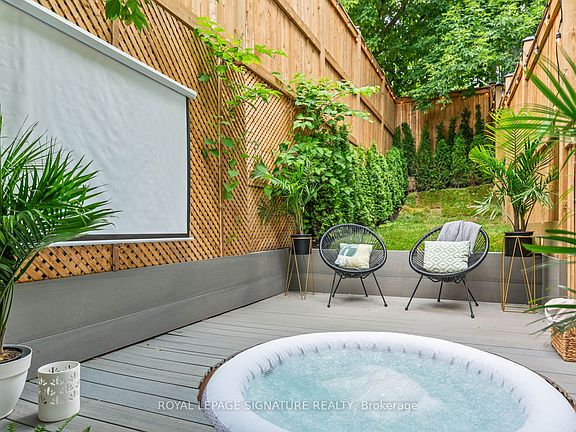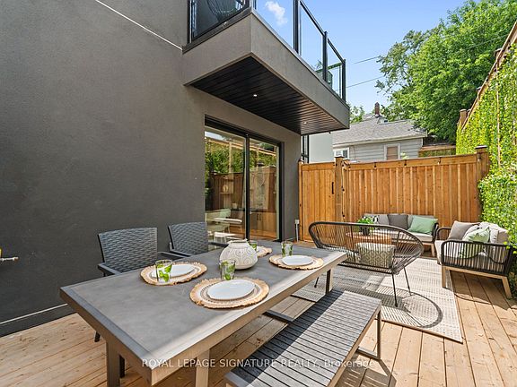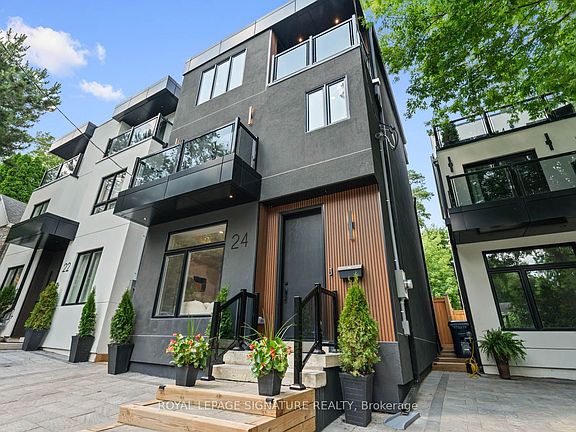 Your Private Oasis in Prime Leslieville!! Welcome to 24 Harriet St! This one-of-a-kind, custom built, detached 3-storey modern masterpiece is nestled on a quiet street in the heart of vibrant Leslieville, just steps to Queen East, trendy cafes, parks, and more. Step into your own private backyard retreat complete with a hot tub, mature trees, privacy fencing, and a massive entertainers deck, perfect for summer nights, outdoor movies, and unforgettable gatherings! Inside, this thoughtfully designed home stuns with its soaring ceilings, wide-plank engineered hardwood floors, and in-ceiling speakers throughout. The gourmet kitchen is a chefs dream with quartz countertops and backsplash, built-in panelled fridge, gas range with pot filler, ample storage, and a large island with seating. The dining area features a stylish feature wall, floating shelves, and custom built-ins, all flowing into a sun-drenched living space with floor-to-ceiling sliding doors for seamless indoor/outdoor living. The upper levels boast three spacious bedrooms, each with their own private balcony, generous closet, and spa-like ensuite bathroom. The luxurious primary suite includes a custom walk-in closet, 2 private balconies and a six-piece ensuite with soaker tub, glass shower, and double vanity. Elegant oak stairs with glass railings enhance the modern aesthetic and open flow. Don't miss this rare opportunity to own a turnkey designer home in one of Torontos most desirable neighbourhoods!