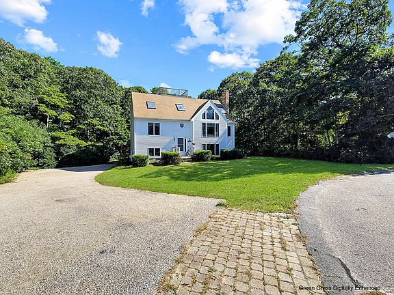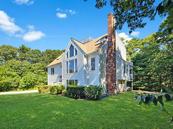 Experience Cape Cod living in this spacious split-level contemporary home on a .9-acre wooded lot, nestled in a quiet cul de sac in highly desirable West Falmouth. Spend the day biking on the Shining Sea Bikeway or enjoy a day at the nearby Chapoquoit beach and when it is time to rinse off, you'll appreciate the convenience of the outdoor shower with its own changing room. With cathedral ceilings, a loft family room, and sunset views over treetops of Buzzard's Bay, this property offers an exceptional retreat. The living room, featuring an extra large gable-end picture window and skylights, is bathed in natural sunlight. The kitchen/dining area opens up to a spacious, covered wooden deck, perfect for gatherings. With 3 bedrooms and an additional 3 bonus rooms in the basement, there's plenty of space for your family and guests. The widow's walk rooftop deck, accessible from the loft terrace and complete with an electricity outlet, creates an ideal spot to sip margaritas while taking in breathtaking views of the ocean.