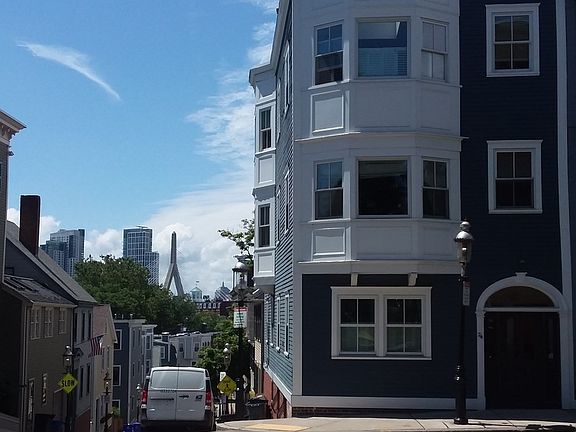 Welcome to historic Charlestown! Sun-filled private entrance corner duplex across from The Bunker Hill Monument and Square with three exposures. Gaslight neighborhood and Monument views from the large living room with wood-burning fireplace and refinished hardwood floors. Renovated country kitchen in 2020 with white quartz counters, American Woodmark grey wood cabinetry and backsplash of white subway tile, with a glorious dining space perfect for entertaining plus a built-in desk or buffet with storage. This spacious home has 2 en-suite bedrooms on the lower level. A half bath on the living level, Stack W/D in the condominium, central air and a common roof deck with amazing Monument and skyline views! New windows, siding and roof in 2014. New HVAC in 2019.