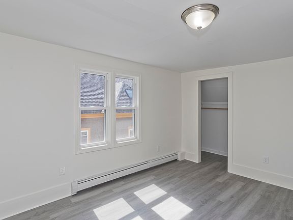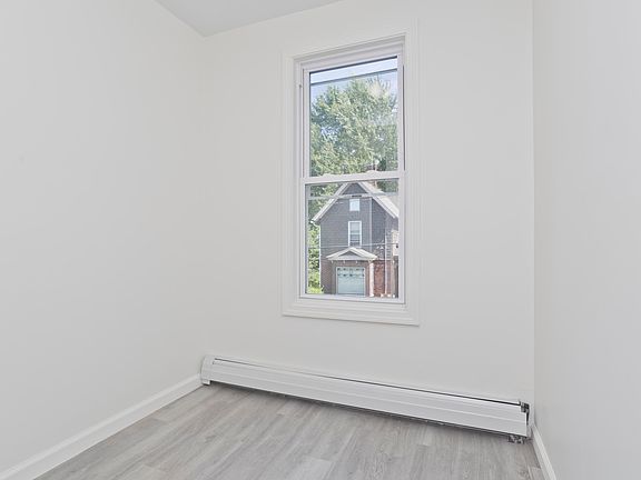 The first floor offers an open-concept living room and kitchen with ample closet space and a convenient half bathroom. The second floor includes two full bedrooms and a full bathroom, while the fully renovated attic provides a private third bedroom or additional living space. Washer and dryer hookups are available in each unit.