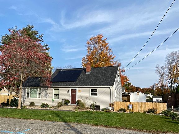 Immaculate Cape-style home with rustic charm on dead-end street close to schools, shopping, Mass Pike. The open living room/dining room combination features original hardwoods, propane Fireplace insert, and French doors that lead to a wooden deck overlooking a private fenced backyard. The kitchen updates include laminate flooring, Butcher Block countertops, and newer stainless steel appliances. Two ample-sized bedrooms and updated ¾ bath with walk-in ceramic tiled shower and ceramic flooring complete the first level. The second floor features a spacious bedroom with new wall-to-wall carpeting, built-ins, double closet, and cedar closet. APO updates include Roof 2017 (100-yr transferrable warranty), vinyl siding 2019, windows & patio door 2017, combination propane boiler/water heater 2019, mini-split AC/heat pump 2020, Tesla solar system installed Jul 2020 (connected Nov 2020); buyer to assume solar agreement - subscription $100/month.