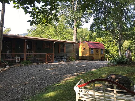 NOW AVAILABLE. BUYER FINANCING FELL APART. Absolutely adorable updated mobile home on beautiful unrestricted property. Vaulted ceilings and large windows make this home feel spacious, light and bright. Laminate hardwood flooring throughout . Pretty counters in both kitchen and baths with unique (beautiful) mosaic tile accents. Large new storage building, and several other outbuildings that could be improved....and an authentic root cellar into the sloping hillside. Vintage swing with fire-pit for outside enjoyment. Single car attached carport currently used as "al Fresco" dining area. Covered patio AND covered deck to enjoy the pretty setting. Peek a boo view of wayah bald and up close mountains. Close to forest service roads for great hiking, biking etc. Could be mini-farm with lots of useable property. Abundant flowering trees and flowers and even a couple apple trees. Super clean and cute. A great escape. Tons of parking and ez access.