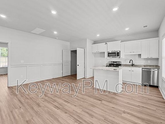 Bathroom with granite countertopStainless steel appliancesWarm welcoming interiorInviting layoutOpen concept layoutEat in kitchenGranite countertops