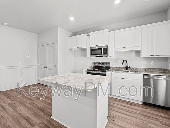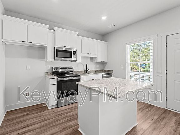 Eat in kitchen with stainless steel appliances, granite countertops and an island