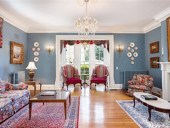 'La Farge Perry House' is a historic home once occupied by renowned painter and stained glass artist John La Farge and his wife Margaret, the grand-daughter of Oliver Hazard Perry. Extraordinarily well-maintained with exceptional period detail this c 1853 residence is rich in history. Built by The Agassiz family, the same family who built the Inn at Castle Hill, the stately residence is comfortable and elegant and boasts an intricately carved staircase, gleaming hardwood floors,wonderful moldings and lighting fixtures. Restored in 1996 by the current owners the home also features an updated kitchen and baths, central air and four reproductions of La Farge's stained glass. At more than 5,900 sq ft and 1/3 acre the home is comprised of 8 bedrooms,7 full baths and 1 half bath and all are well appointed. Principal rooms include a formal living room and dining room painted with a beautiful original mural painted in 1920's, a large kitchen with porch and pantry, family room, office and an en-suite bedroom. The 2nd floor offers a 800 sq ft master suite with a large bathroom and ample closet space, an additional en suite bedroom and a full in-law apartment. The 3rd floor includes 4 bedrooms with baths and has a wonderful view of the Newport city scape and the bridge. The 55 ft front porch is perfect to watch the activity of town while the private back yard is loaded with flowering plants and trees and all in the heart of Newport's Kay-Catherine neighborhood and a walk to town