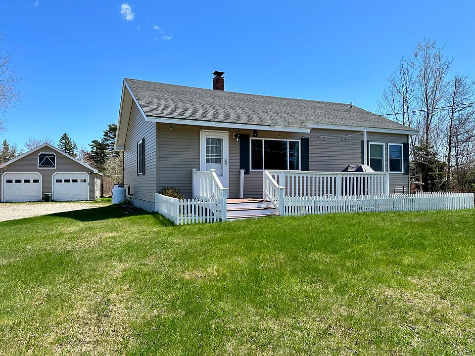 This well-kept bright and sunny ranch has a history of rental income on the separate cement pad existing on the property. Behind the two-car garage there is chicken coop and the side yard has an enclosed garden; it's a good location near town to have a homestead on this over 3 acre property. Many features of this home make it inviting: a year-round sunroom, fun kitchen bar, open living-dining room, two bedrooms with a bonus room, two bathrooms, large clean basement with wood stove, workshop corner, storage corner and laundry. The front deck is just right for enjoying the outdoors and grilling. Just moments from town and move-in ready, must see!