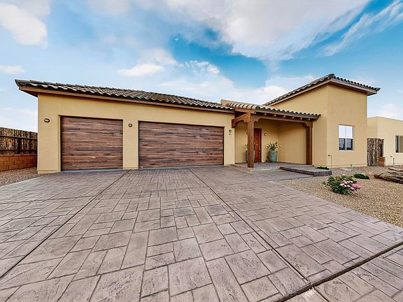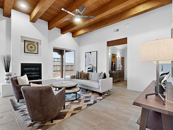 Enjoy breathtaking 180-degree scenic views from this distinctive Santiago Plan with 2239 sq. ft. Located in the La Pradera Subdivision. The property backs up to open space. This residence features three bedrooms and three and a half bathrooms. Each bedroom includes its own ensuite bath. There are three fireplaces throughout the home.Arrive through an impressive 8-foot-tall entry door, stepping into a foyer highlighted by a 13-foot boveda ceiling. To the left, a powder room and an adjacent closet provide convenience, while to the right, a versatile study or bedroom features a cozy gas-fired kiva fireplace. The spacious living room is distinguished by a 12-foot ceiling, rich brown-stained wood beams with tongue-and-groove trim. Porcelain floor tiles in a Bianco-White wood-like style add elegance throughout the home. The open kitchen is equipped with Shaker-White cabinets. The kitchen and the guest bedroom open out to a covered portal with a gas-fireplace and brick pavers, perfect for entertaining or relaxation. The owner’s suite features an expansive walk-in closet of approximately 100 square feet. The luxurious bathroom offers a skylight, a spacious walk-in shower with Euro-style fixtures, and an overhead rain shower head. Designed in a classic Spanish style, the home showcases a pitched roof with clay-concrete tiles, covered portals with substantial wood beams, and brick paver accents. The colored stamped concrete driveway enhances the property’s curb appeal. The property also boasts a three-car insulated garage with two storage closets and an epoxy-coated floor.