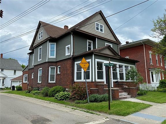 WOW!!! LOOK at this CLASSIC BEAUTY!! 4 bedrooms with 2 full bathrooms, AWESOME enclosed front porch, 2 car detached garage, second floor laundry, ABSOLUTELY BEAUTIFUL HARDWOOD FLOORING, SUPER NICE updated kitchen with granite counter tops, travertine tile back splash, mahogany cabinets, flooring is ceramic tile and a water purification system. The formal dining room has an amazing chandelier that seller brought back from Czechoslovakia!! Off of the Kitchen, you'll find a newer addition that can be used as a family room, entertainment room, bonus room or man cave!! The rooms are spacious with gorgeous high ceilings and lovely woodwork through out. Wait until you see the upstairs bathroom~it is SO AWESOME !! Each bedroom has an electric wall heater!! There is a huge walk up attic for lots of storage, or renovate for more living space!! This home is walking distance to Intermediate and Hornell High school, to banks, downtown restaurants, salons and churches. All NEW replacement windows, NEW vinyl siding on upper portion of House, new roof and overhead doors on garage, plus a New electric panel !! PRICED TO SELL....WON'T LAST LONG !!!!!