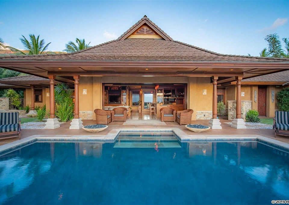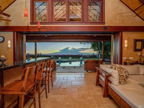 The most intriguing and special property you will view in Launiupoko with stunning ocean and island views. Tucked away at the end of a cul-de-sac, this private sanctuary is heavenly. Towering coconut palms and lush tropical landscaping with panoramic views of the ocean and neighboring islands invite you into this Balinese inspired home. Evening is transformed with landscape lighting highlighting this beautiful property. Entrance to this property has a beautiful carved teak and copper gate for privacy. The living area has fully retractable pocket doors bring the outside in, giving effortless enjoyment to the indoor/outdoor lifestyle. Soaring ceilings throughout with bamboo matting complete this unique and exotic retreat. One of a kind finishes and detail throughout with Balinese teak wood trim and carved doors along with stone etchings and pillar details. This is a property you will fall in love with. Situated on 1.24 acres of Cpr'd land with panoramic ocean views and the spectacular West Maui Mountains as a back drop. This is a two bedroom 2 bath with an outdoor dining Pavilion surrounded by lush tropical landscaping that provides the ultimate privacy. Two outdoor showers provide for the unique bathing experience and are perfect for this sunny climate. A beautiful saline pool along with an additional custom stone water feature 40ft in length and outdoor lighting that accentuate the many tropical flowers and fruit trees that surround the garden all contribute to the ultimate private Zen outdoor space. The home has a central a/c, central vac and security system and a gated entrance with a two car garage. Being sold fully furnished with just a few art pieces excluded.